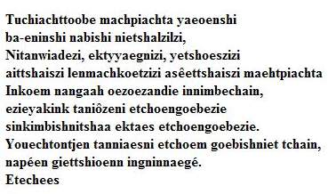 The Lord's Prayer Tuchiachttoobe machpiachta yaeoenshi ba-eninshi nabishi nietshalzilzi, Nitanwiadezi, ektyyaegnizi, yetshoeszizi aittshaiszi lenmachkoetzizi aseettshaizi maehtpiachta Inkoem nangaah oezoezandie innimbechain, ezieyakink taniozeni etchoengoebezie sinkimbishuitshaa ektaes etchoengoebezie. Youechtountjen tanniaesni etchoem goebishniet tchain, napeen giettshioenn ingninnaege. Etechees.