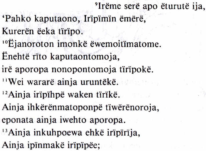 9 Irëme serë apo ëturutë ija, Pahko kaputaono, Irïpïmïn ëmërë, Kurerën ëeka tïrïpo. 10 Ëjanoroton imonkë ëwemoitïmatome. Ënehtë rïto kaputaontomoja, irë aporopa nonopontomoja tïrïpokë. 11 wei wararë ainja uruntëkë. 12 Ainja irïpïhpë waken tïrïkë. Ainja ihkërënmatoponpë tïwërënoroja, eponata ainja iwehto aporopa. Ainja inkuhpoewa ehkë irïpïrïja, Ainja ipïnmakë irïpïpëe; The Lord's Prayer